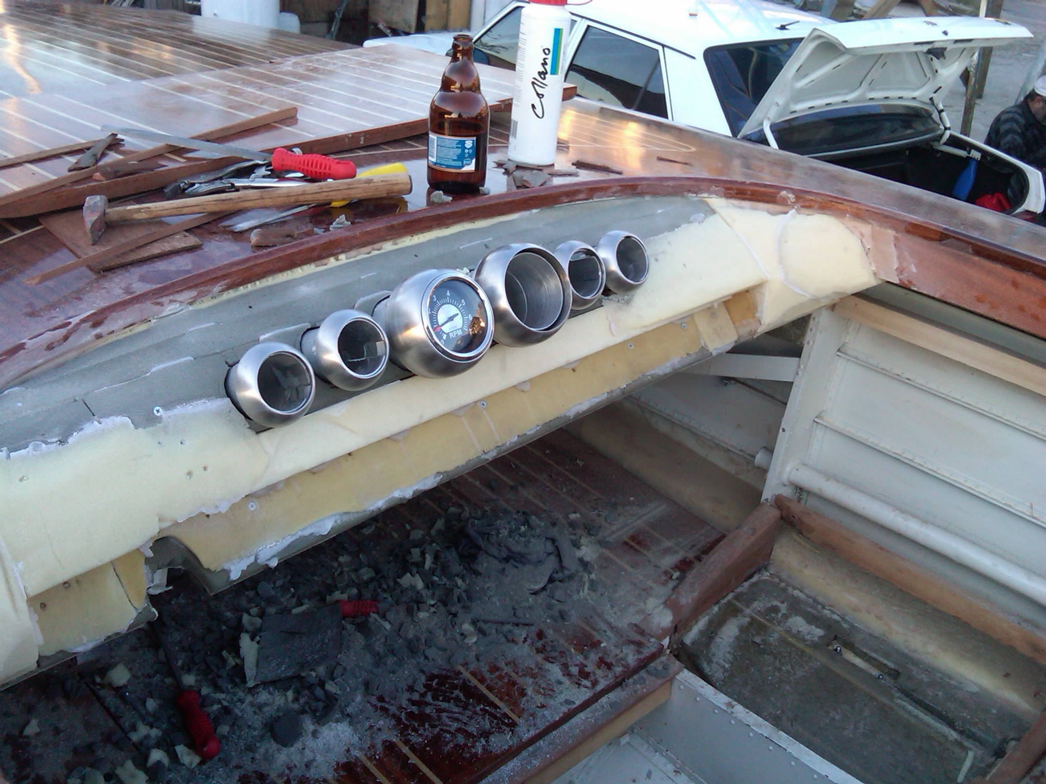 The material is pvc hardfoam sheets, we are sanding. The pipes for the gauges are Aluminium and they will be fixed via epoxy. The bezels are of stainless steel and what you can not see on the photo there are stainless steel guide/cover pipes, that will be shaped to the dashboard. The dashboard will after proper sanding be covered with epoxy and glass fiber, later a UV resistant beige artificial leather will be glued on. Below there will be an aluminium cover with all other switches, radio etc ...