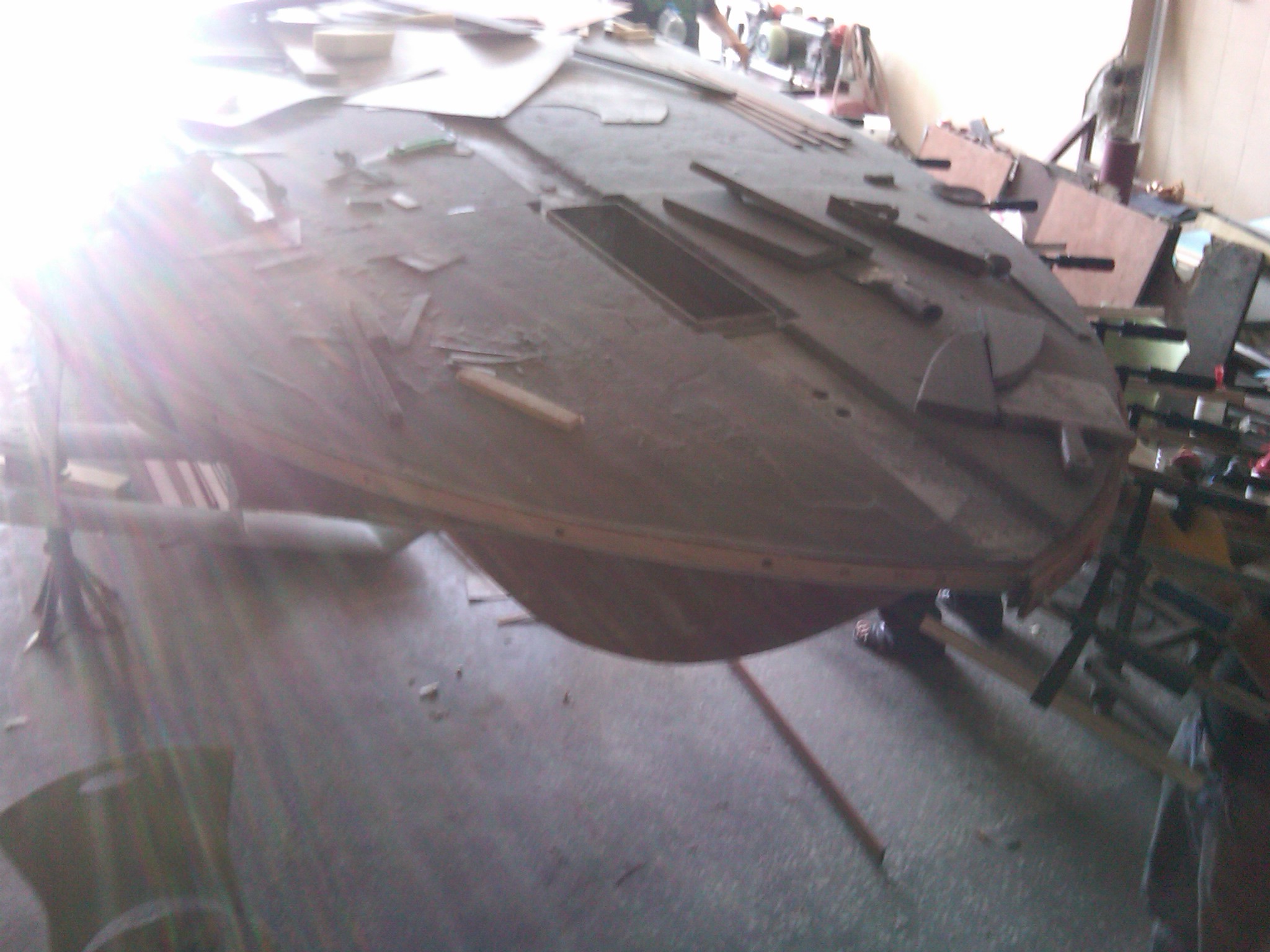 Here you can see the front with the hardfoam being coverd with epoxy resin layers and fibre. This hardfoam sheets were glued and later rounded with sandpaper. Although the material was easy to sand it took some time to check whether the shapes were equally rounded and we had to measure and control with a long aluminium square profile uneven places and either sand them or fill them lateron with epoxy layers. Afterall we had to sand them again. We had to swallow a lot of this dust and created a huge dirty mess, but my Volga had bumps on the deck we could not mend properly and taking too much mastic whould probably not have been suitable either. The result of this 20 mm sanded layer however is really strikingly beautiful. The slight rounding of the deck now gives the Volga a gentler line.