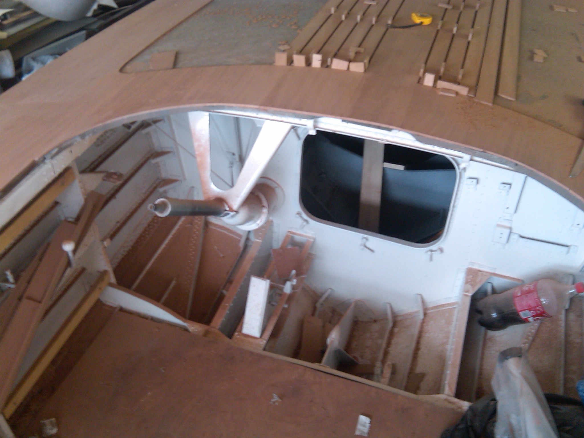 My original design of the cockpit was also raped, as it was intended to have the dashboard plate under the deck. However they introduced a construction that urged us also to change the design here. Instead of coming out down-under it will be somehow attached to. I will try to make it not be visible ... otherwise I will also destruct and rebuilt it.